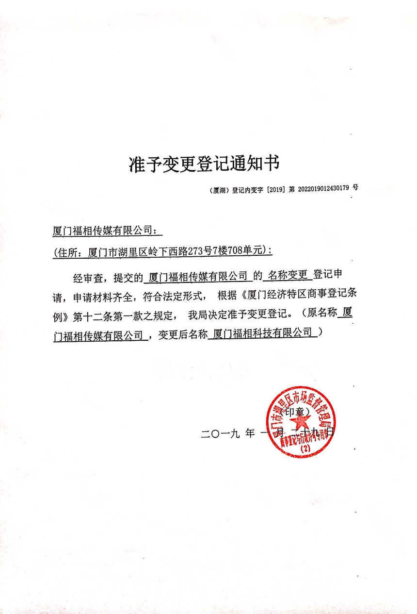 关于厦门福相科技有限公司更名的告知函关于厦门福相科技有限公司更名的告知函 尊敬的各界人士:为更好适应市场和转型升级战略发展需要,公司原名称“厦门福相传媒有限公司”已于2019年4月24日依法变更为“厦门福相科技有限公司”,公司简称为“福相科技”。现将有关更名事项作以下说明: 一、公司法定代表人、业务主体、经营地址和法律关系不变,原有的业务关系和服务承诺保持不变。 二、关于公司开票资料请联系本公司相关人员索要,为确保资金的安全性,请于汇款前与相关部门及人员确认。 因公司名称变更给您带来的不便,我们深表歉意!衷心感谢您一贯的支持和关照,我们将一如既往地和您保持愉快的合作关系,并希望继续得到您的关心和支持。